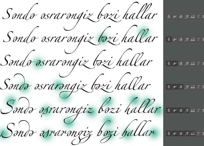Mətni seçib Fonts.. dialoq qutusunda Advanced tab bölümündə OpenType Features zövqümüzə uyğun dəyişiklikləri edə bilərik. Fərqi göstərmək üçün aşağıda misal var: