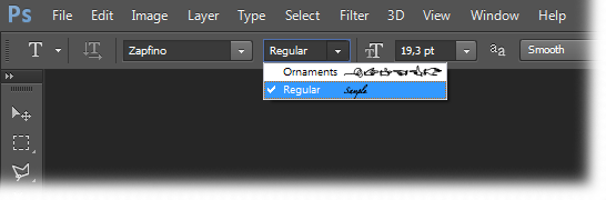 Zapfino fontu ornament əlavələri ilə gəlməkdədir, ətraflı məlumatı bu .pdf faylından tapa bilərsiniz. Photoshopda Ornaments ayrı font kimi deyil, ailə fərdi kimi istifadə edilir: